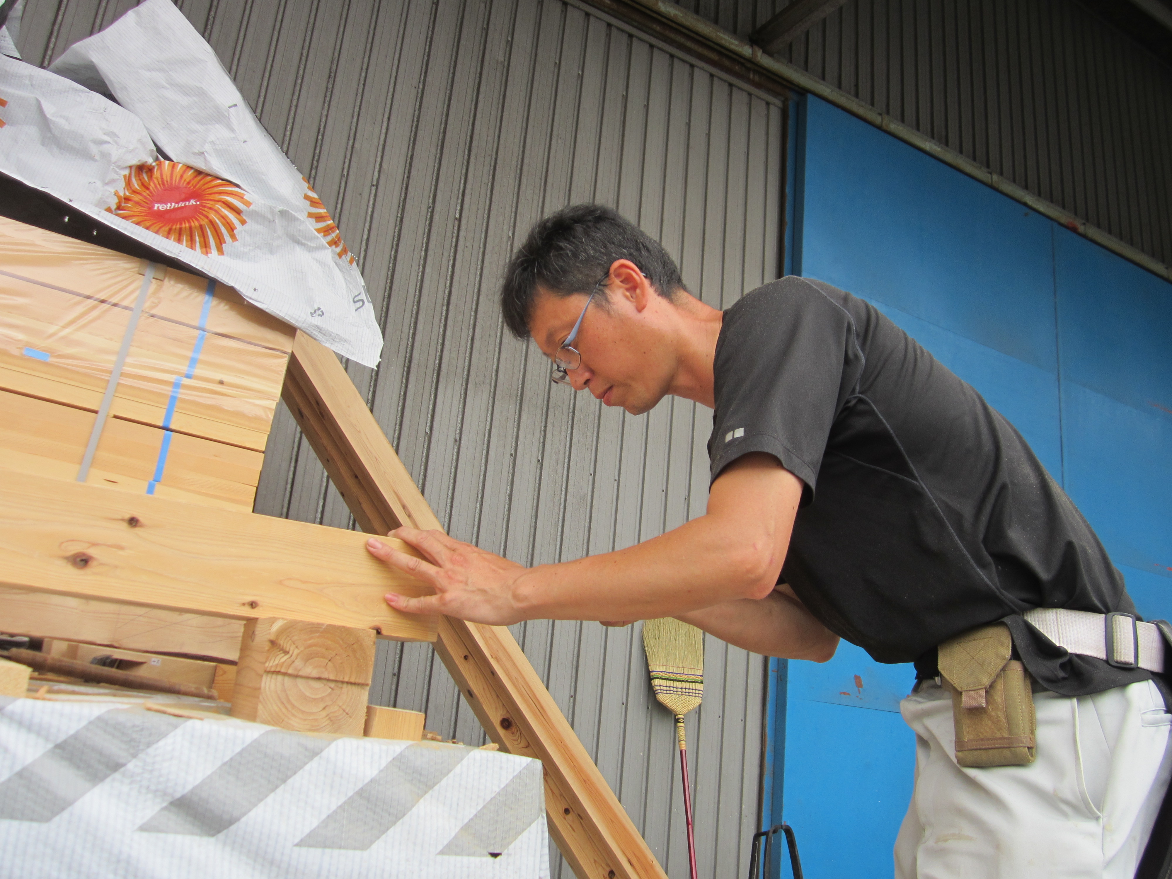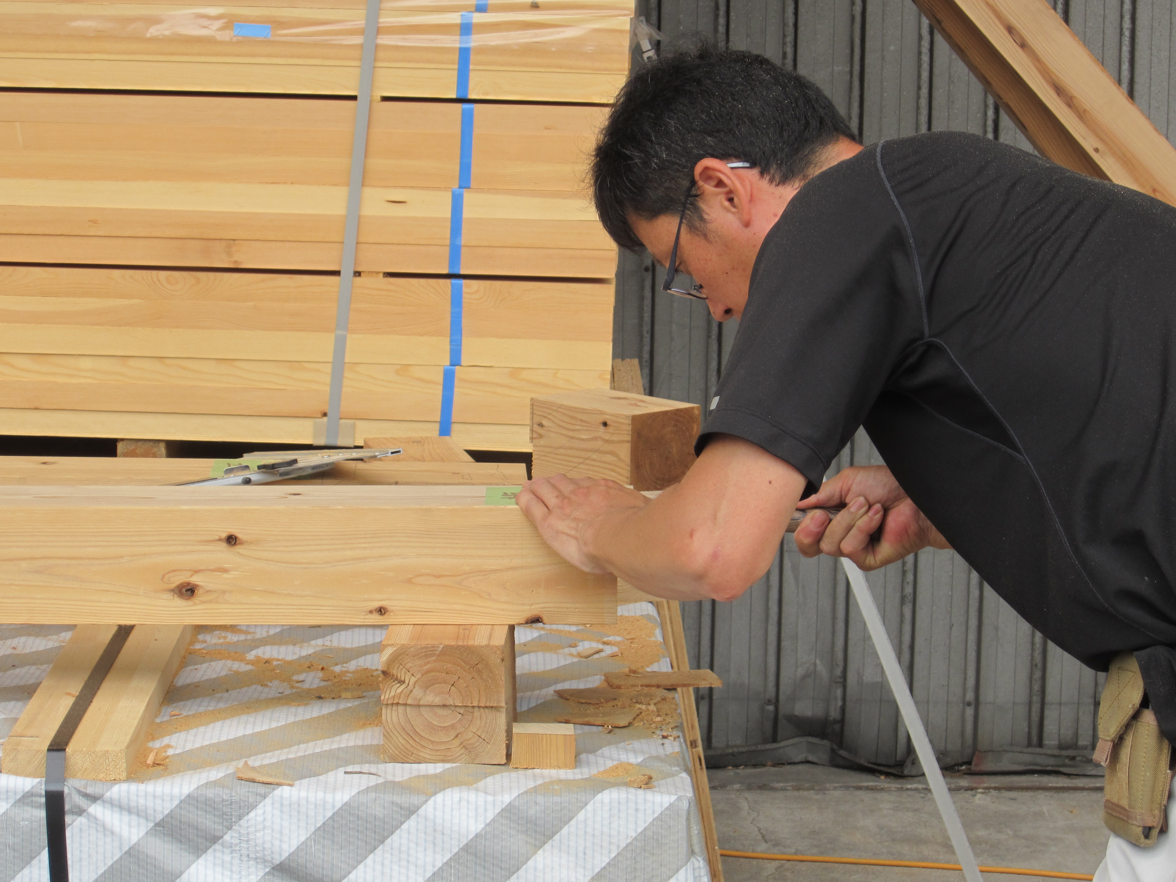 子ども棟上げ体験の木材をひたすら削ります。あついっ