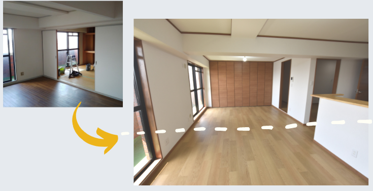 白いラインから奥が和室でしたが仕切りを無くして一続きの大きな空間のリビングになりました。