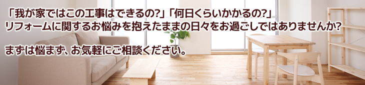 弊社ではしつこい営業は一切いたしません。リフォームの場合は、個々の住まいの状況を実際に見て確認しないと正確な金額が出ないケースが多いですし、いい提案やプランもできません。見積もり後に断っても構わないのですから、積極的に御相談なさってください。