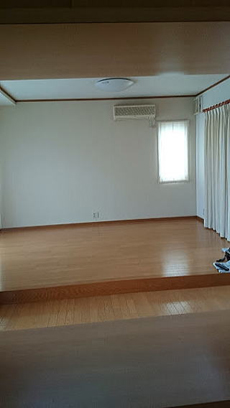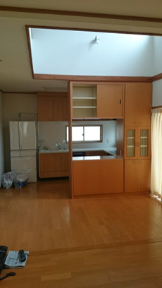 | 施工前のキッチンの様子です。棚がどうしても圧迫感を与えてしまいます。 | 施工前のリビングです。 |