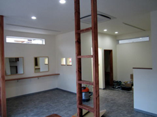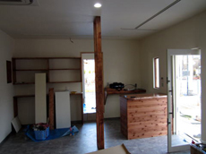 | 施工中です。白を基調にゆったりとした雰囲気にしていきます。 | 木をアクセントに。完成が楽しみですね。 |